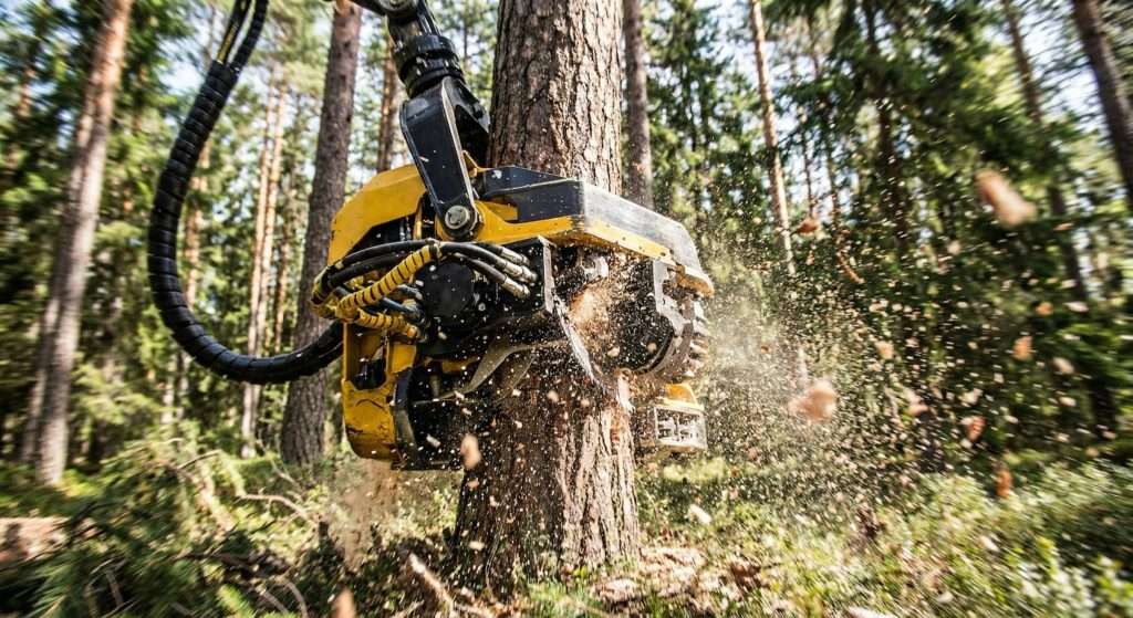 Der Harvester entastet, schneidet und sortiert das Holz direkt im Bestand (Sägeholz vs. Industrieholz).