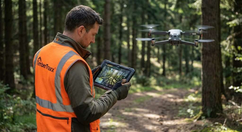 Unser Scout fährt Ihr Waldstück an und startet die Drohne am Wegesrand.